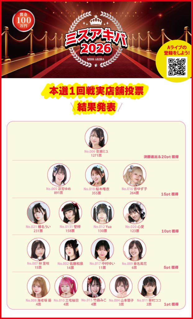 審査員投票 最終ポイント合計数1位がミスアキバ2026グランプリに決定